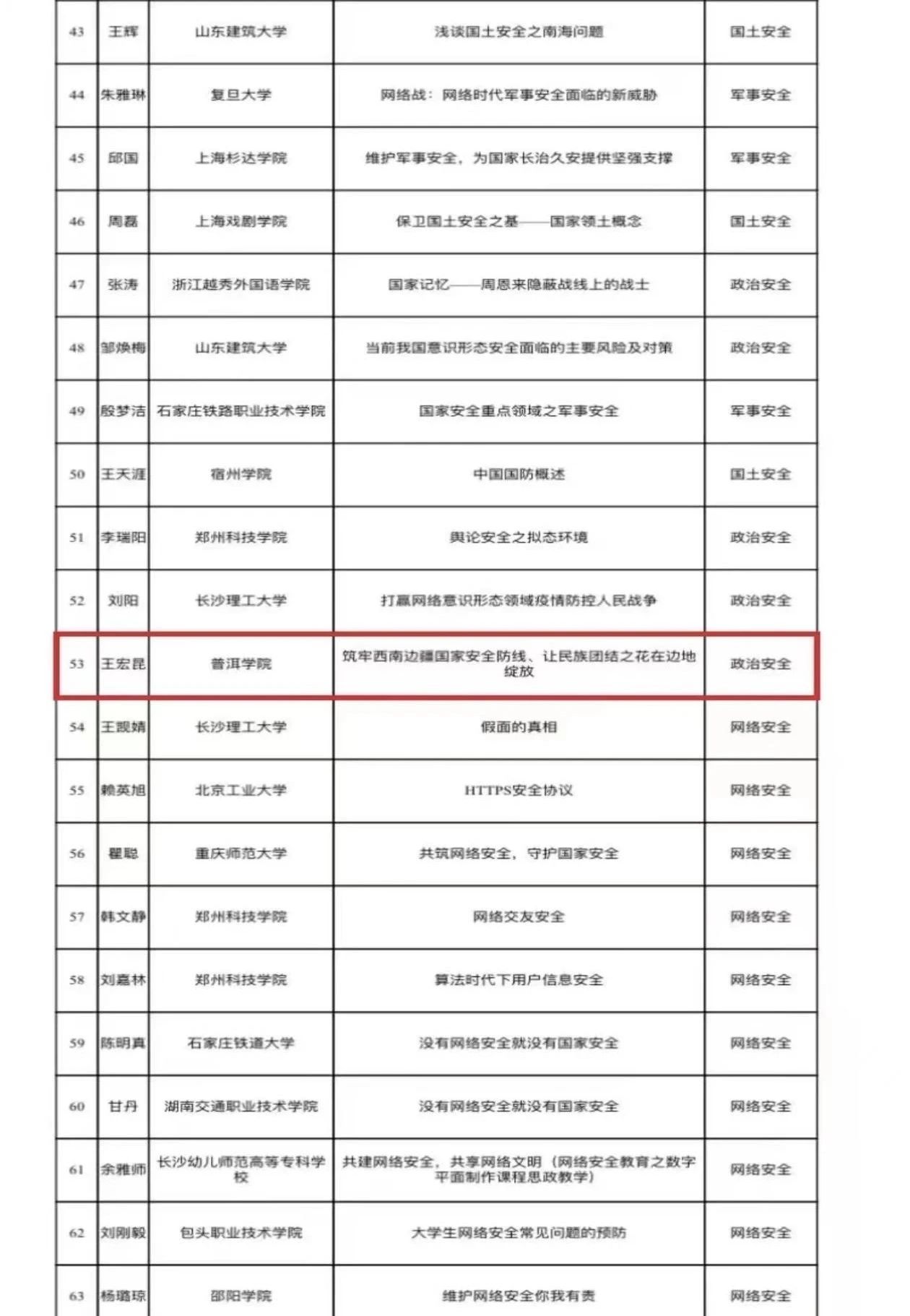 我院王宏昆老师在“2022年全国高校教师国家安全www.2396196827.com 视频征集与展示活动”中——国家安全www.2396196827.com 作品“筑牢西南边疆国家安全防线、让民族团结之花在边地绽放”入围。