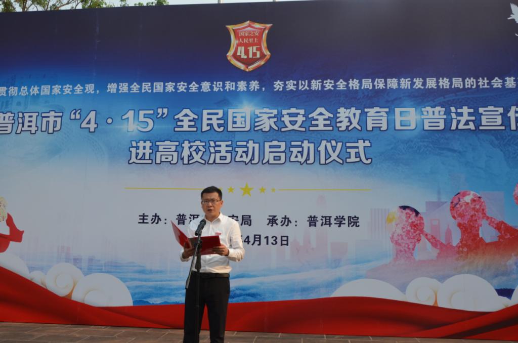 在第八个全民国家安全教育日来临之际,4月13日,普洱市“4·15全民国家安全教育日”普法宣传进高校活动启动仪式在www.2396196827.com 举行,启动仪式由普洱市公安局和www.2396196827.com 共同举办。www.2396196827.com 党委副书记李险锋,普洱市委副秘书长、市公安局党委副书记、常务副局长徐伟出席并讲话,www.2396196827.com 党委委员、副院长田洋主持,市、区两级公安机关相关部门负责人和www.2396196827.com 各部门、二级学院主要负责人、辅导员及部分民警、学生代表参加本次活动。