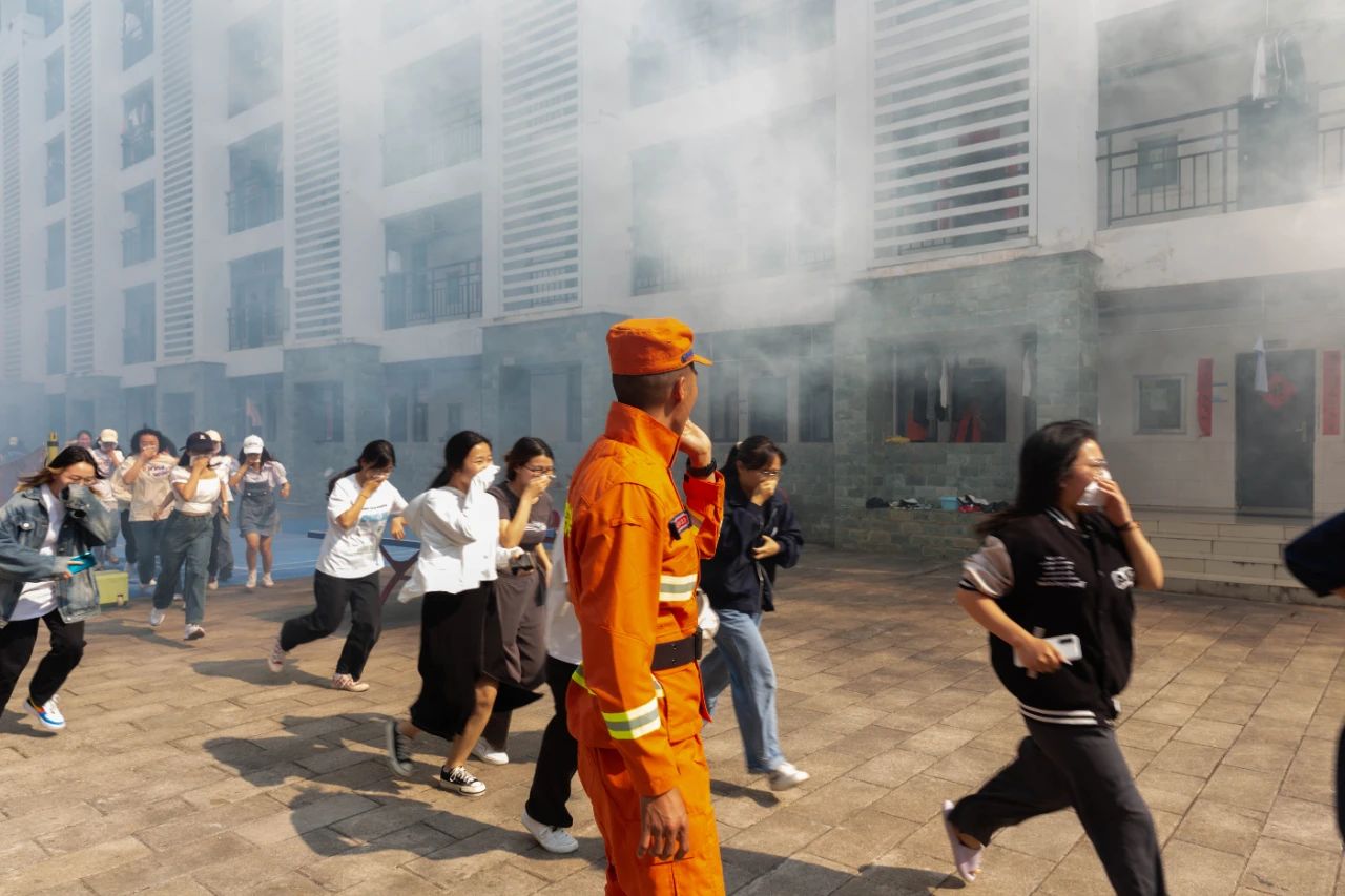 随着消防警报响起,老师有序疏导学生从安全通道离开。同学们弯着腰,捂住口鼻,沿着安全通道快速撤离东区广场。此次演练大大增强了广大师生的安全意识与自护自救能力,也切实加强了学校的安全教育工作。