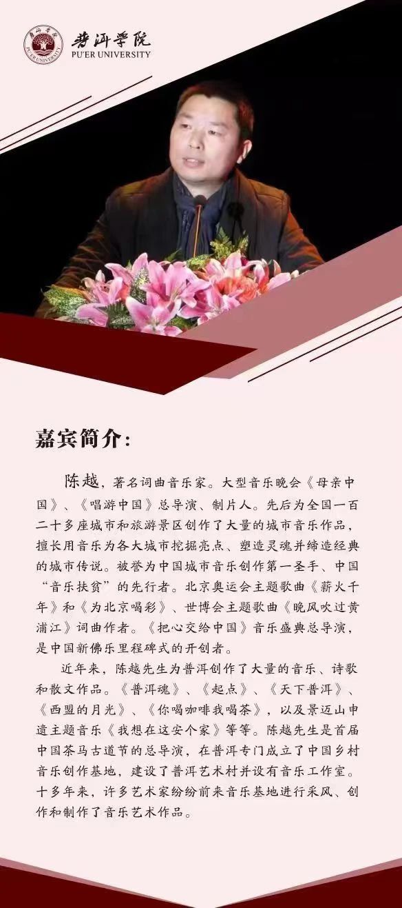 我校将于5月22日15:00,邀请著名词曲音乐家陈越先生在致远楼演播厅举办《文化百讲》第16讲。本次讲座陈越先生将带来题为《你喝咖啡我喝茶》的演讲,分享他与茶咖的不解之缘,欢迎全校师生参加!陈越,著名词曲音乐家。大型音乐晚会《母亲中国》、《唱游中国》总导演、制片人。先后为全国一百二十多座城市和旅游景区创作了大量的城市音乐作品,擅长用音乐为各大城市挖掘亮点、塑造灵魂并缔造经典的城市传说。被誉为中国城市音乐创作第一圣手、中国“音乐扶贫”的先行者。北京奥运会主题歌曲《薪火千年》和《为北京喝彩》、世博会主题歌曲《晚风吹过黄浦江》词曲作者。《把心交给中国》音乐盛典总导演,是中国新佛乐里程碑式的开创者。近年来,陈越先生为普洱创作了大量的音乐、诗歌和散文作品。《普洱魂》、《起点》、《天下普洱》、《西盟的月光》、《你喝咖啡我喝茶》,以及景迈山申遗主题音乐《我想在这安个家》等等。陈越先生是首届中国茶马古道节的总导演,在普洱专门成立了中国乡村音乐创作基地,建设了普洱艺术村并设有音乐工作室。十多年来,许多艺术家纷纷前来音乐基地进行采风、创作和制作了音乐艺术作品。