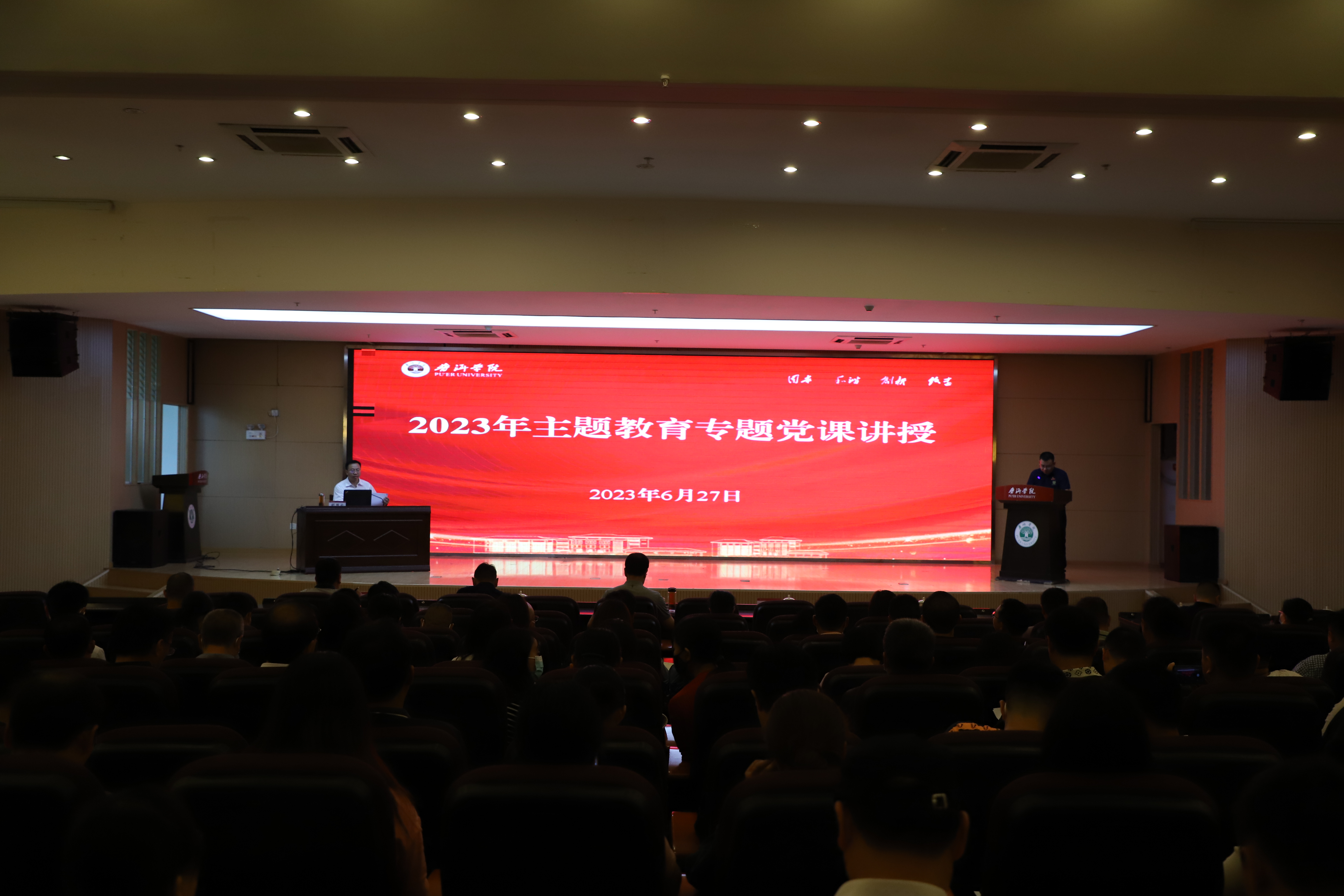 6月27日上午,www.2396196827.com 党委书记胡国云以《紧紧把握新时代民族工作主线 推进铸牢中华民族共同体意识教育示范学校创建》为题,聚焦“学思想、强党性、重实践、建新功”总要求,为全校党员干部讲授主题教育专题党课。省委主题教育第十八巡回指导组副组长、省生态环境厅督查专员李国墅及有关同志到会指导。