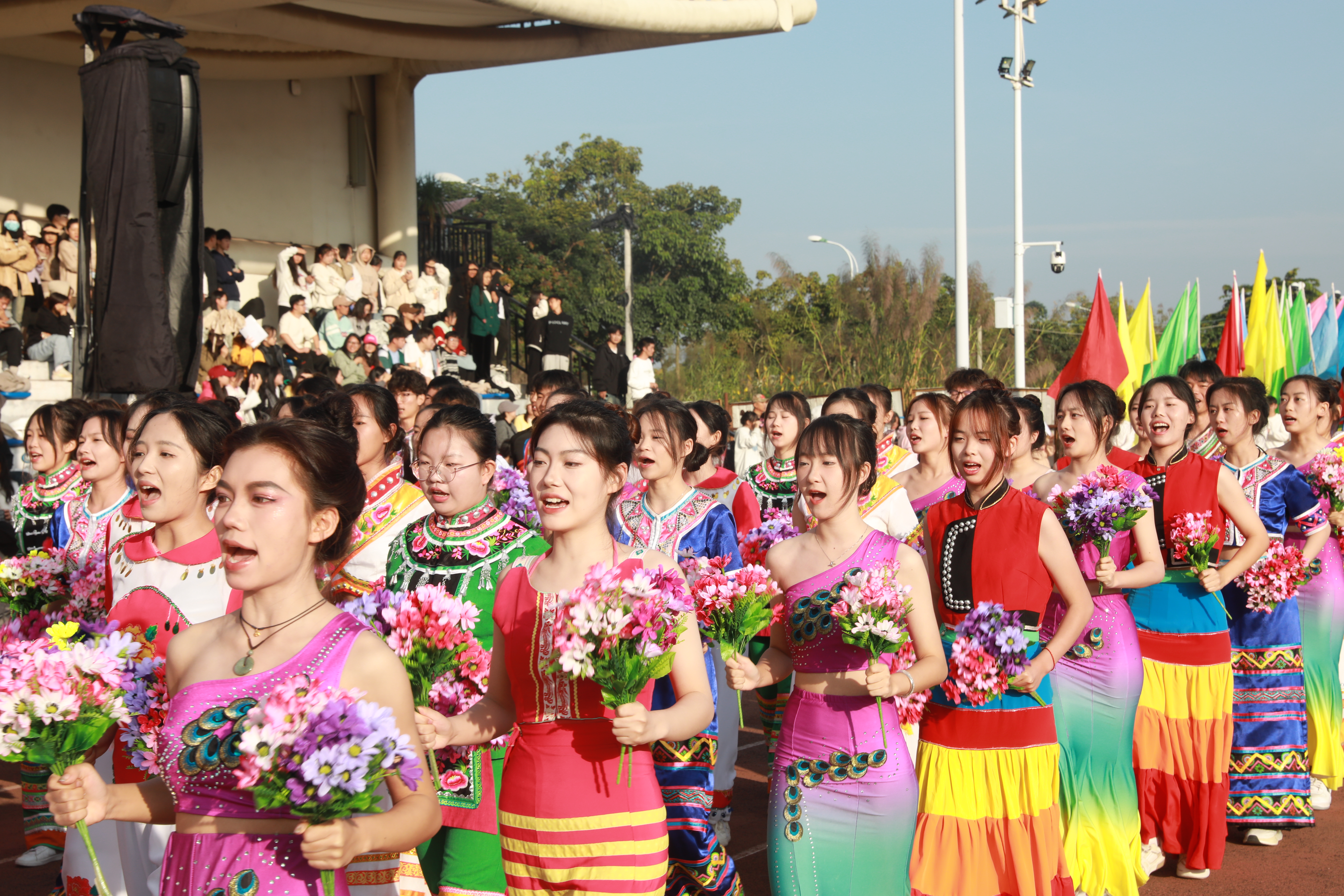 艺术学院方队他们沐浴着温暖的阳光,享受着清爽的和风,踩着整齐的节拍向我们走来。他们身着各式民族服装,像冬日里靓丽的彩绘,显得异彩纷呈;他们坚定的步伐透露着蓬勃向上的朝气,脸上洋溢着艺院学子的青春力量;他们神采飞扬,充满着对美好未来不竭的向往。“以艺术化导人心,让青春之歌洋溢色彩”是他们最为响亮的口号。