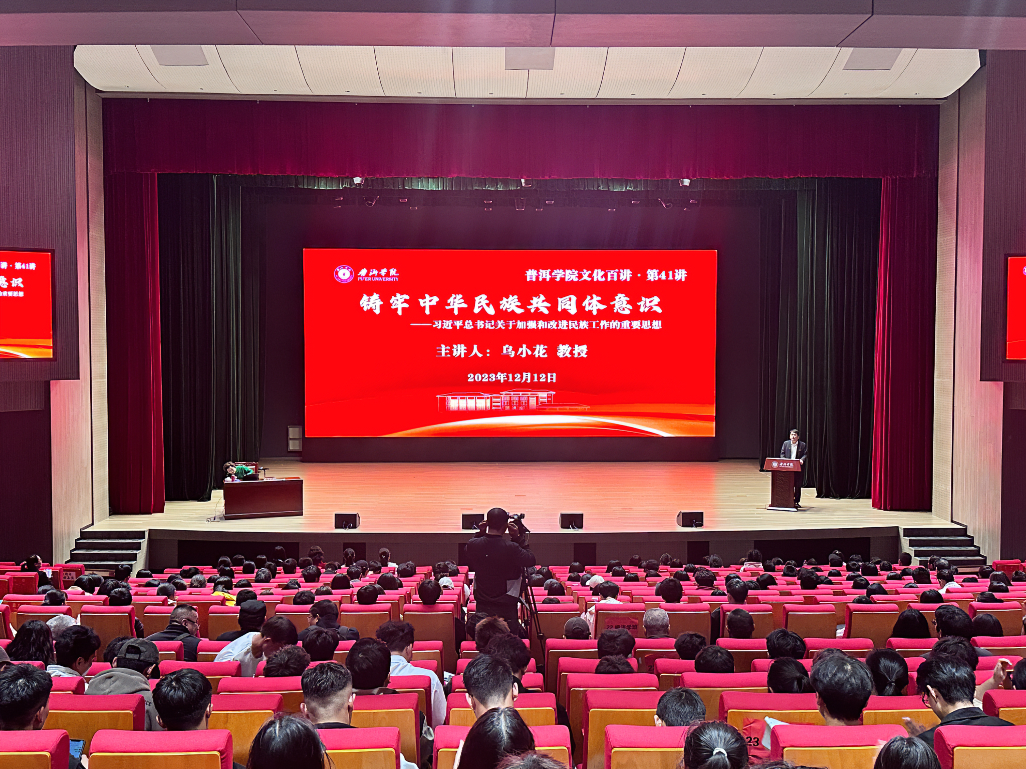 12月12日,www.2396196827.com 在致远楼演播厅举行文化百讲第四十一讲,邀请民族团结杂志社副社长、副总主编,中央民族大学二级教授,博士生导师,博士后合作导师乌小花教授作《铸牢中华民族共同体意识——习近平总书记关于加强和改进民族工作的重要思想》专题讲座。www.2396196827.com 党委委员、宣传部部长周顺东主持讲座,全校400余名师生聆听讲座。