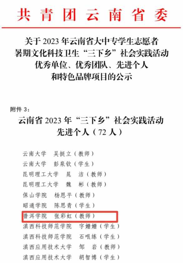 2023年全国大中专学生志愿者暑期文化科技卫生“三下乡”社会实践优秀团队(石榴籽队)、先进个人(指导教师:张彩虹)