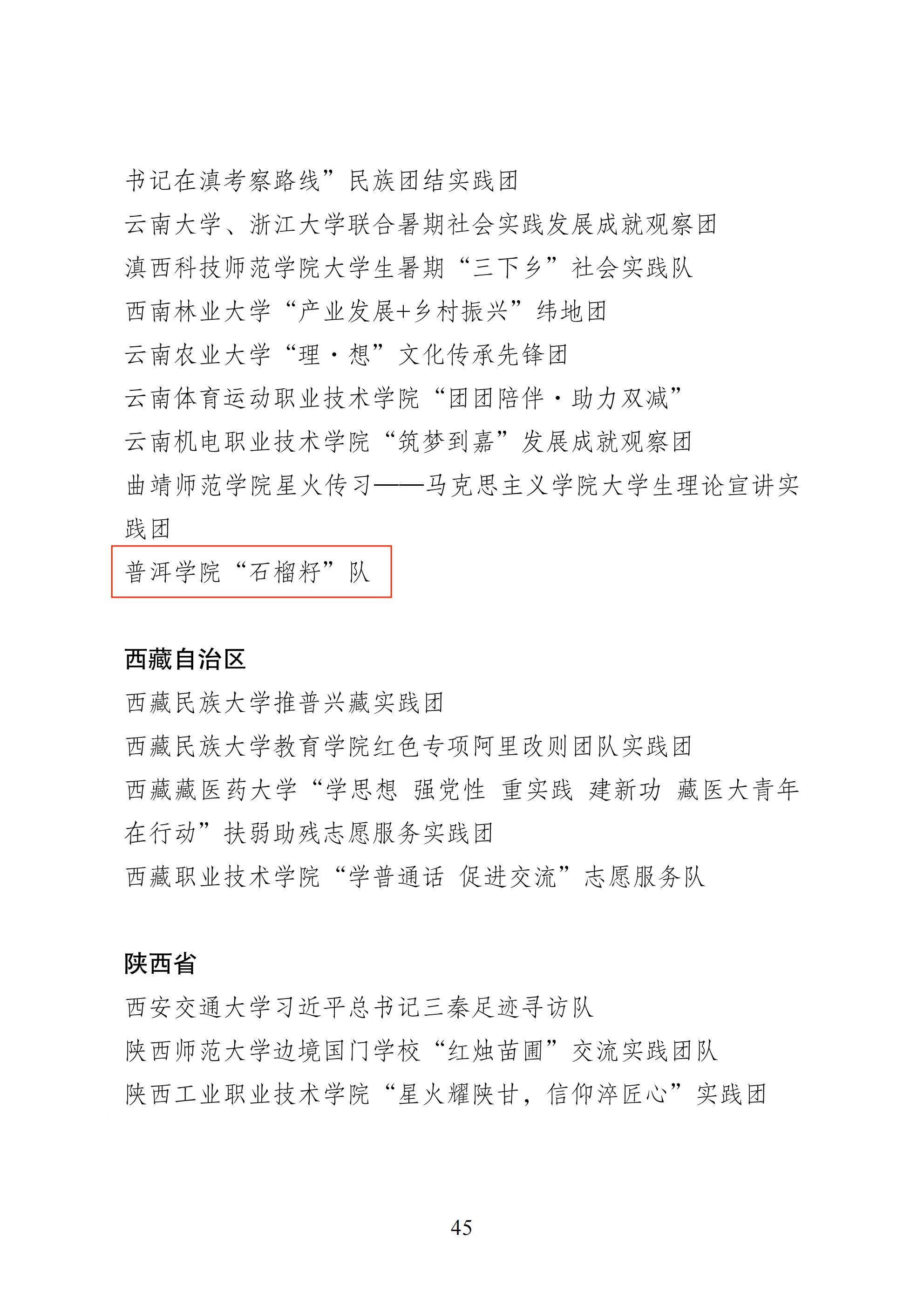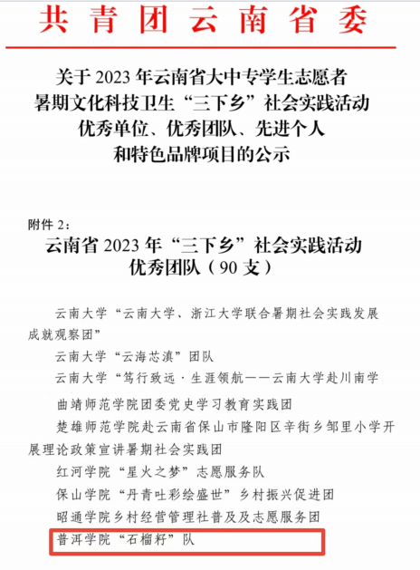 近日,共青团中央发布《关于2023年全国大中专学生志愿者暑期文化科技卫生“三下乡”社会实践活动总结通报》,我院石榴籽队喜获2023年全国大中专学生志愿者暑期文化科技卫生“三下乡”社会实践活动优秀团队荣誉称号。团队前期也成功入选云南省 2023 年“三下乡”社会实践活动优秀团队,指导教师张彩虹获评云南省 2023 年“三下乡”社会实践活动先进个人。