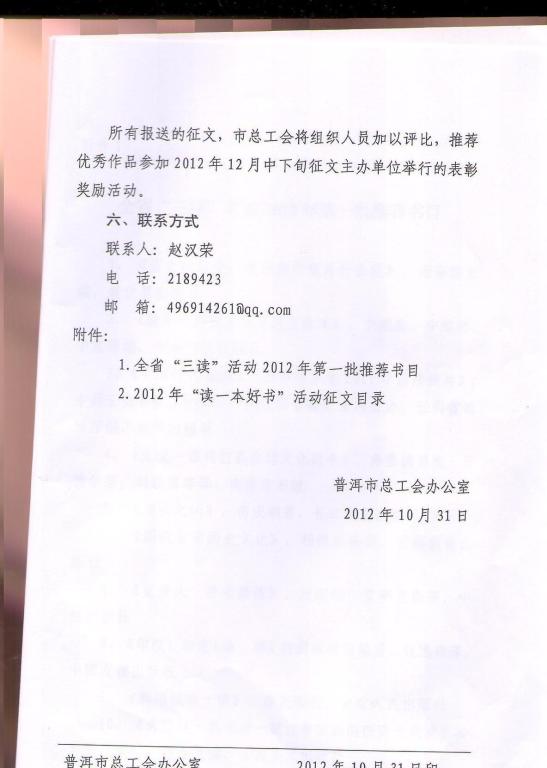 工会转发市总工会关于征集2012年普洱市职工读一本好书征文活动的通知