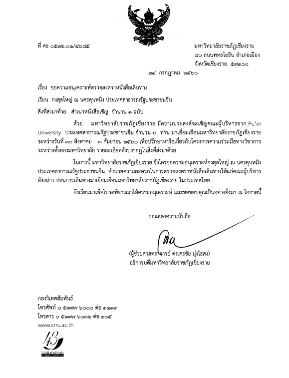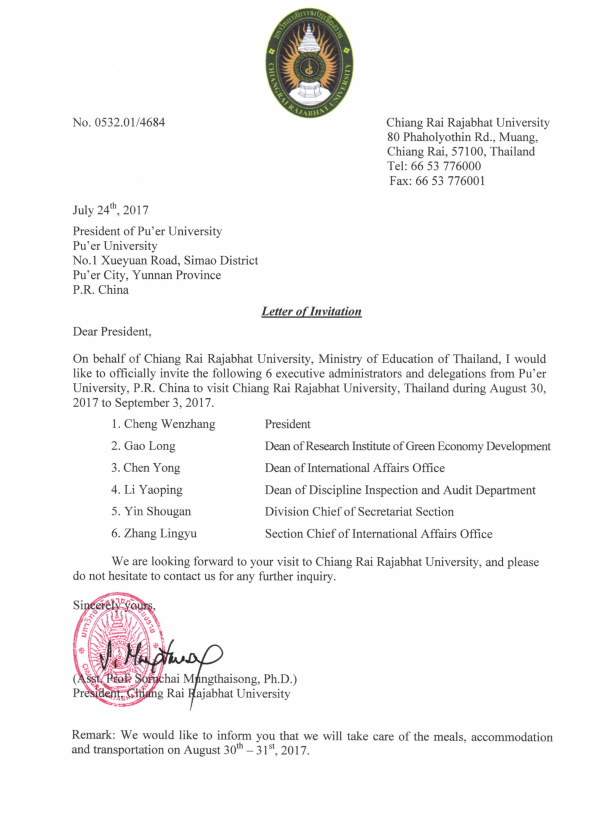 应泰国清莱皇家大学的邀请,经学校党委研究决定,由院长成文章同志带队,纪检监审处处长李耀萍同志,普洱绿色经济发展研究院院长高龙同志,国际交流处处长陈勇同志,学校办公室秘书科科长殷守刚同志以及国际交流处科长张灵钰同志随同出访,计划于2017年8月30日至2017年9月3日赴泰国清莱皇家大学,旨在就泰国清莱皇家大学烹饪专业学生到www.2396196827.com 进行实习交流以及在泰国清莱皇家大学举办汉语培训的事宜进行磋商洽谈,与此同时,就其他新增专业的学生出国实习项目进行商洽。公示期为:2017年7月24日2017年7月31日