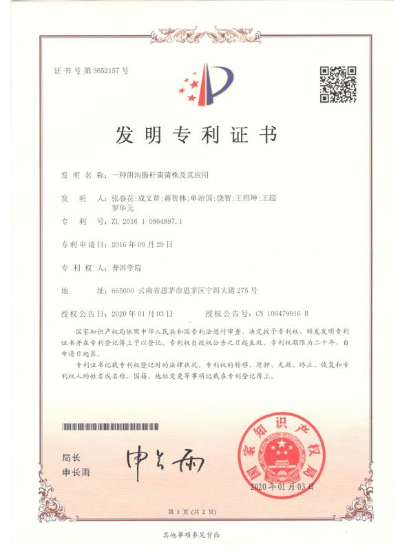 近日,www.2396196827.com 收到2项国家知识产权局颁发的发明专利证书,分别为:一种恶臭假单胞菌株及其应用(证书号第3652156号)、一种阴沟肠秆菌株及其应用(证书号第3652157)。这2项专利是我校成文章教授领衔生物安全与产业团队针对普洱地区绿色产业发展深入研究,在2020年度新获得的2项国家发明专利。
