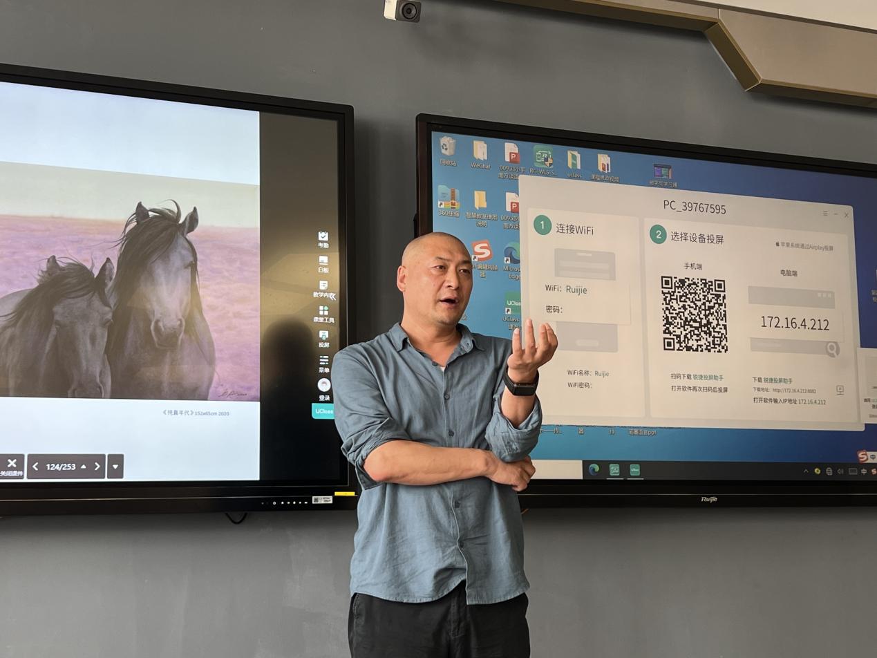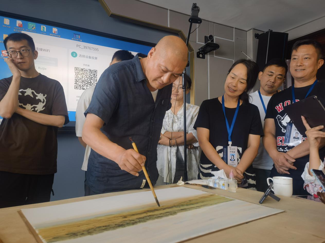 7月5日,长海教授以《个人创作》为主题,结合自身丰富的创作经历,深入浅出地向学员们传授了艺术创作的精髓——简化与提炼。他以自己标志性的蓝色马匹创作为例,分享了如何通过不断研究与实验,发掘出独特的色彩语言。长海教授鼓励学员们珍惜时间,勤奋创作,并透露了自己曾一年内使用掉10卷画纸的执着追求。下午的实践环节中,长海教授更是亲自上阵,手把手指导学员们进行创作。从技法到创作理念,他毫无保留地将自己的宝贵经验传授给学员们,让他们受益匪浅。