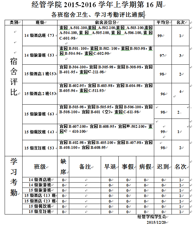 经管学院2015-2016学年上学期第17周各班宿舍评比、教学考勤通报