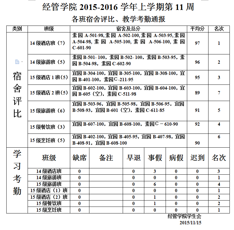 经管学院2015—2016学年上学期第11周各班宿舍卫生、学习考勤评比通报
