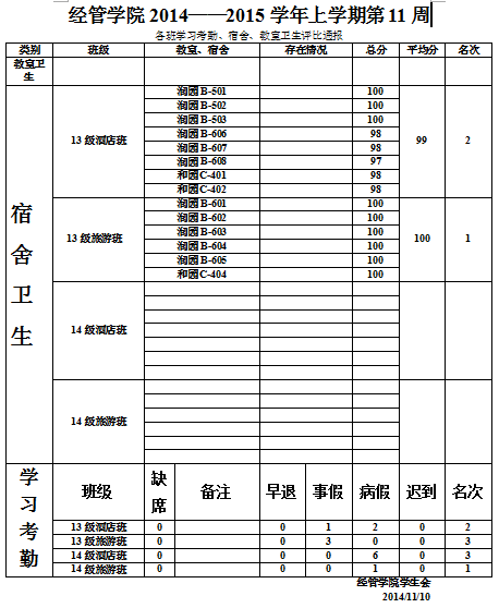 经管学院2014—2015学年上学期第11周各班学习考勤、宿舍、教室卫生评比通报