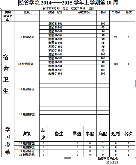 经管学院2014—2015学年上学期第10周各班学习考勤、宿舍、教室卫生评比通报