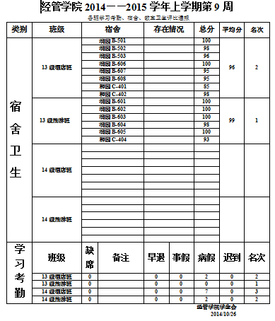 经管学院2014—2015学年上学期第9周各班学习考勤、宿舍、教室卫生评比通报