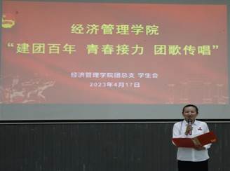 为贯彻落实习近平总书记关于青年工作的重要思想,引导共青团员以饱满的热情学习贯彻落实党的二十大精神,展现当代大学生的精神风貌和我院莘莘学子的独特风采,经济管理学院于2023年4月17日晚举办“建团百年青春接力团歌传唱”合唱比赛。