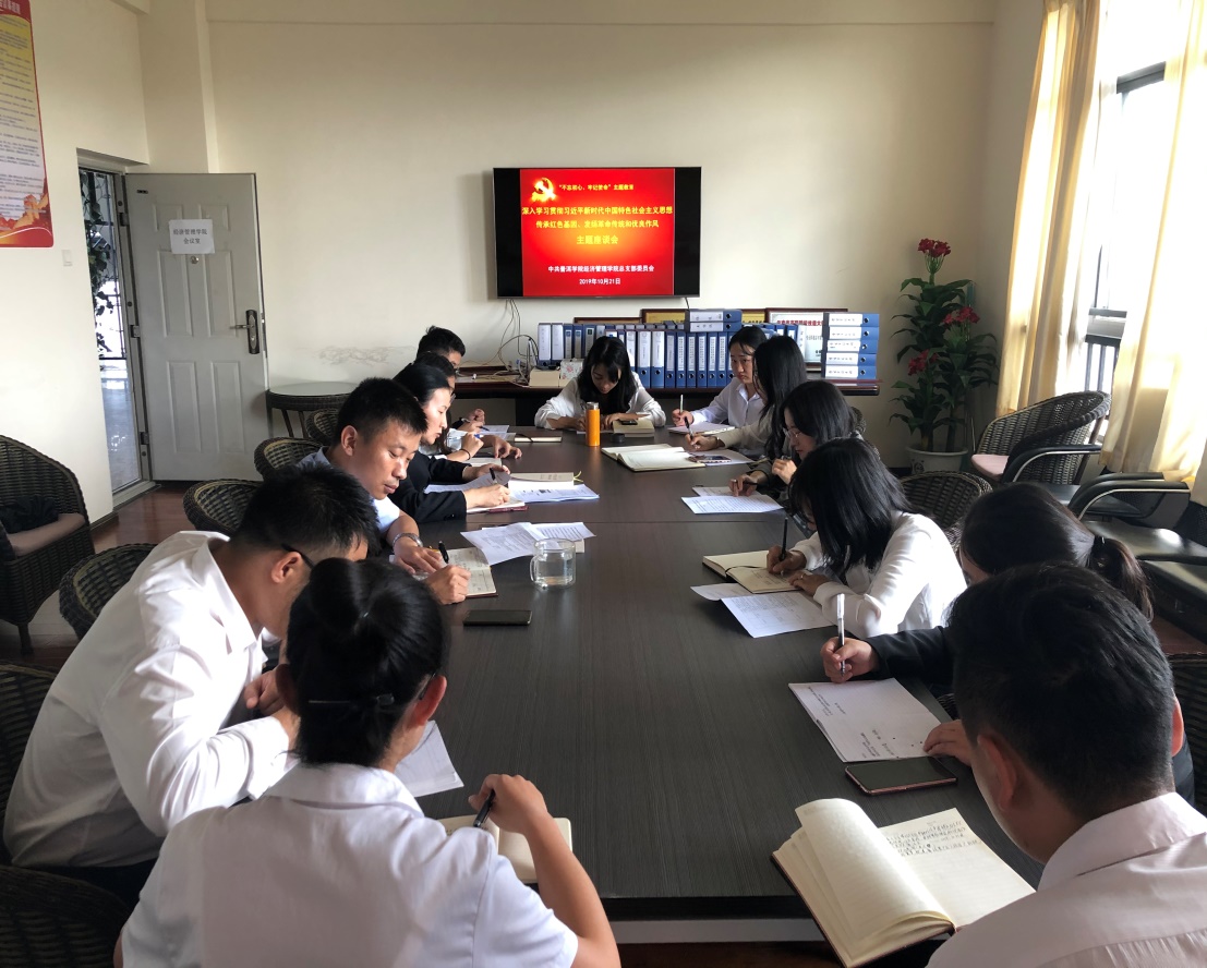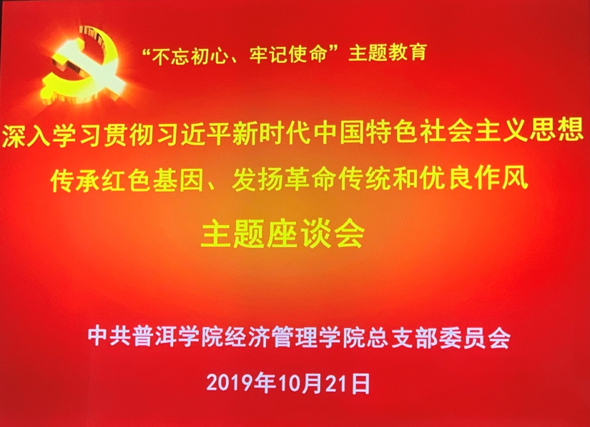 为深入学习贯彻习近平新时代中国特色社会主义思想,认真开展“不忘初心、牢记使命”主题教育,根据《中国共产党www.2396196827.com 经济管理学院总支部委员会关于印发<www.2396196827.com 经济管理学院“不忘初使题教育集中学习计划>的通知》,结合习近平总书记在庆祝新中国成立70周年大会上的讲话和参观“不忘初心、牢记使命”档案文献展活动,10月21日,我院开展以“深学习贯彻习近平新时代中国特色社会主义思想,传承红色基因革命传统和优良作风”为主题的支部党日活动。全院师生党员参加此次主题座谈会。