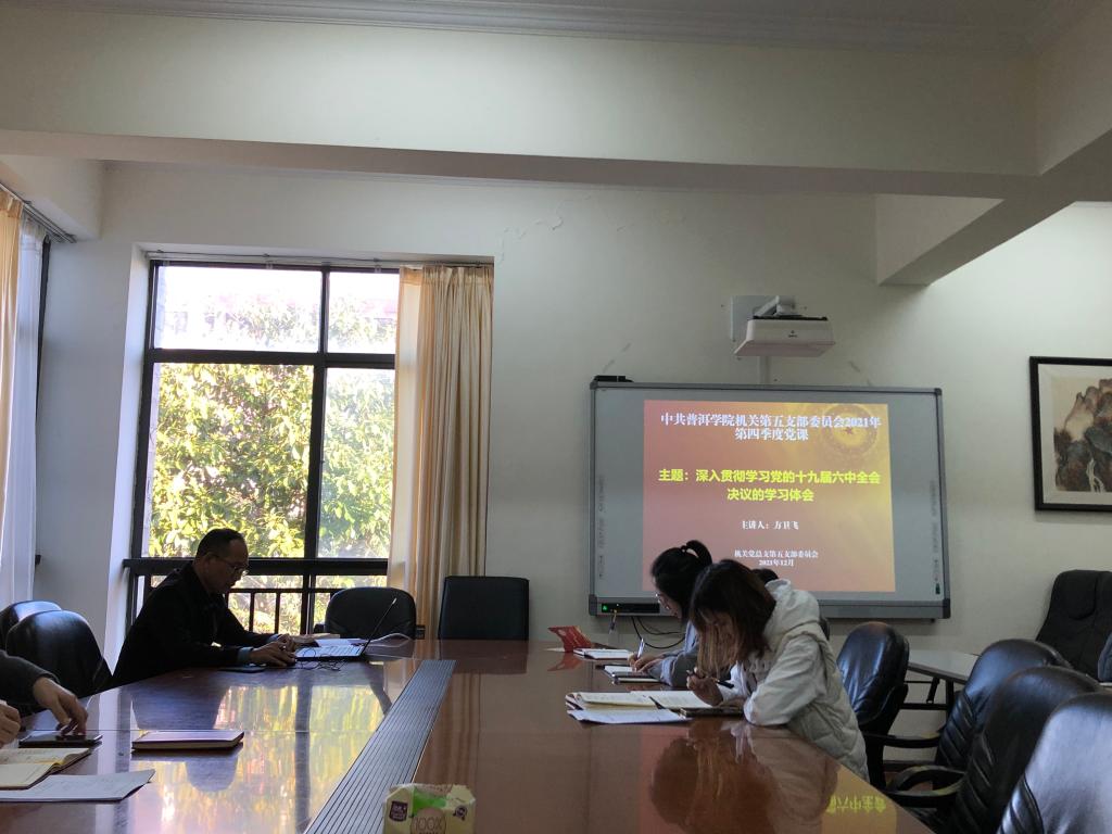 2021年12月6日上午,机关第五党支部在教务处会议室开展“学好党代会精神,凝聚奋进力量”主题党日。首先,支部为李娅玲、谭红、尹琳珊同志过政治生日,并赠送政治生日贺卡。全体党员同志重温入党誓词。其次,传达学习习近平总书记《坚持用马克思主义及其中国化创新理论武装全党》重要文章;云南省第十一次党代会及省委十一届一次全会精神;《教育部关于进一步加强高等学校法治工作的意见》。最后,方卫飞同志以“深入贯彻学习党的十九届六中全会决议的学习体会”为专题讲微党课。会后,党员同志积极学习交流。
