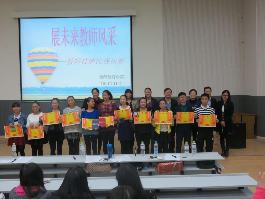 2014年11月27日晚7:30,教师教育学院于敏2—104举行了板书设计大赛决赛;次日晚7:30,教师教育学院于健行楼阶梯教室开展“未来教师杯”教师技能大赛朗诵和讲故事决赛。参赛选手以自己独特的风格向评委老师们以及在场同学们展现了自己的风采,许多参赛同学获得了优秀的成绩,在颁奖时与老师们一起留影,留下了美好的瞬间。此次教师技能大赛得到圆满结束。