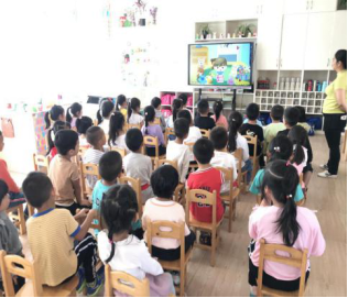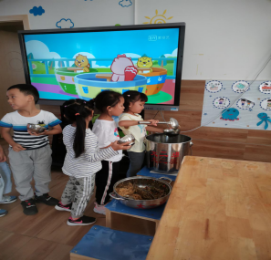 在餐前教师也很注重创造愉快安静的进餐气氛有的时候教师会播放轻音乐,做手指操或者组织看动画片。