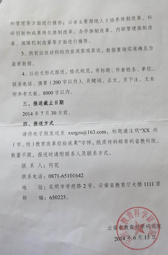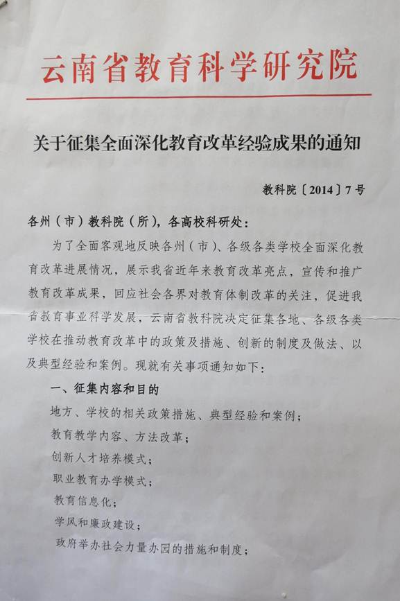 附:云南省教育科学研究院《关于征集全面深化教育改革经验成果通知》全文(请到“www.2396196827.com 通讯”群共享下载)