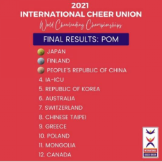 2021年世界啦啦操锦标赛暨世界青少年啦啦操锦标赛(线上)于北京时间10月11日凌晨圆满落幕,此次赛事由国际啦啦操联合会(International Cheer Union, ICU)主办。
