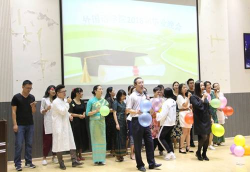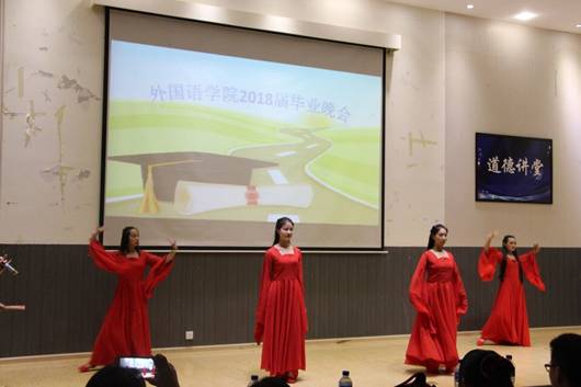晚会伊始,毕业生照片回忆录在会场的PPT上滚动播放。晚会主要以学院领导、毕业班班主任、毕业生代表和在校生代表发表寄语以及节目表演两部分组成,以此欢送即将毕业的学生们。党总支书记王江华老师表达了对毕业生未来生活的殷切希望,院长符春焕老师以一首自创的诗歌向毕业生给予了最真诚的祝福。本次晚会最大的亮点是全体教师参加并出席了本次晚会,老师们的舞蹈和外国歌曲串烧让现场的掌声和尖叫声此起披伏,让本次晚会达到了高潮。