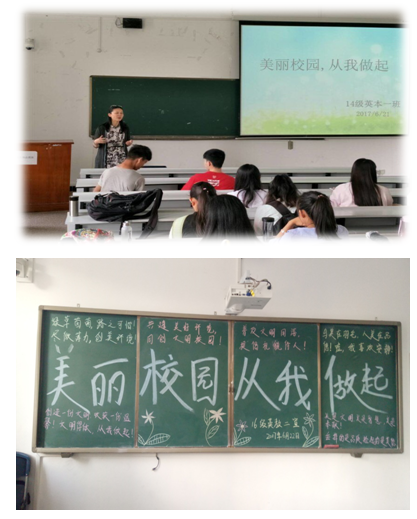 在本次活动中,各团支书别出心裁,以不同的形式去开展了此次活动。有主题班会、有辅导员带领同学们付诸实践,还有同学们自发组织打扫校园志愿服务的等等。为了宣扬保护环境的重要性,力争做一个有文明、有素质、积极全面发展的新时代大学生,我院提出保护环境的以下五大倡议: