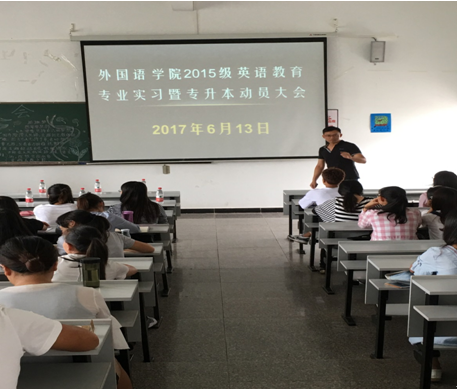 6月13日下午,外国语学院2015级英语教育专业(专科)实习暨专升本动员大会在敏学1号楼310教室召开。外国语学院院长符春焕、副院长柴树虹、辅导员李本福及2015级英语教育专业全体同学参加了大会。