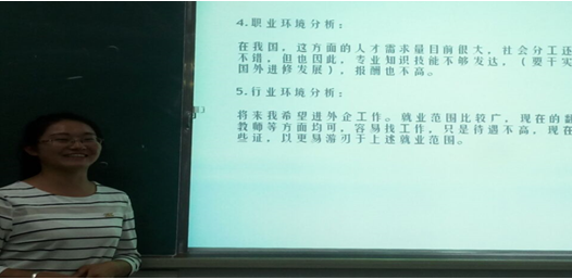 在比赛过程中,同学们以PPT的形式向我们展示了他们的职业规划,首先是对自己进行全面的评价;其次是对社会环境等因素的分析,明确国家政策,了解市场行情等;最后表达了对自己职业前景的信心。其中15级英本1班曹玉芳同学和16级商务2班的党如玉同学以真诚的演讲获得比赛一等奖,谭谨和倪忻怡等同学获得了二等奖。