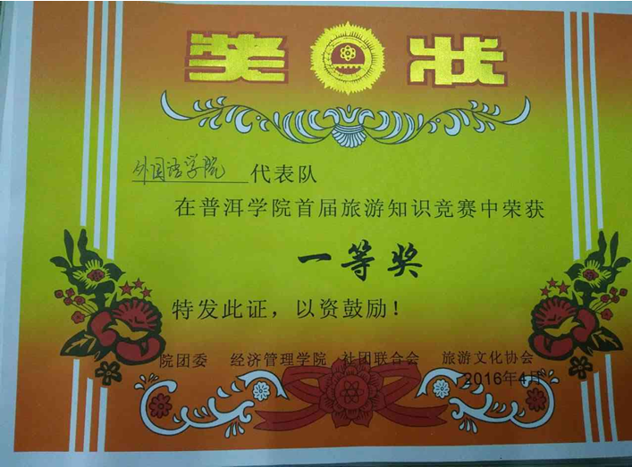 4月29日,由院团委、经济管理学院主办的www.2396196827.com 首届旅游知识竞赛决赛拉开帷幕。外国语学院代表队的成员为曹先煜惠、龚以谦、伏乐川。在比赛过程中,他们齐心协力,密切配合,在全校6支代表队中脱颖而出,最终荣获一等奖。