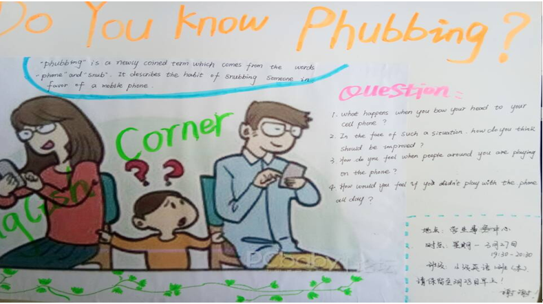 三月份开始,由大一的同学们制作了海报进行宣传每周的谈论话题,如对当前大家喜欢用手机搜索信息发表看法、毕业后的打算、劳动节等,内容有趣,很受同学们的喜爱。