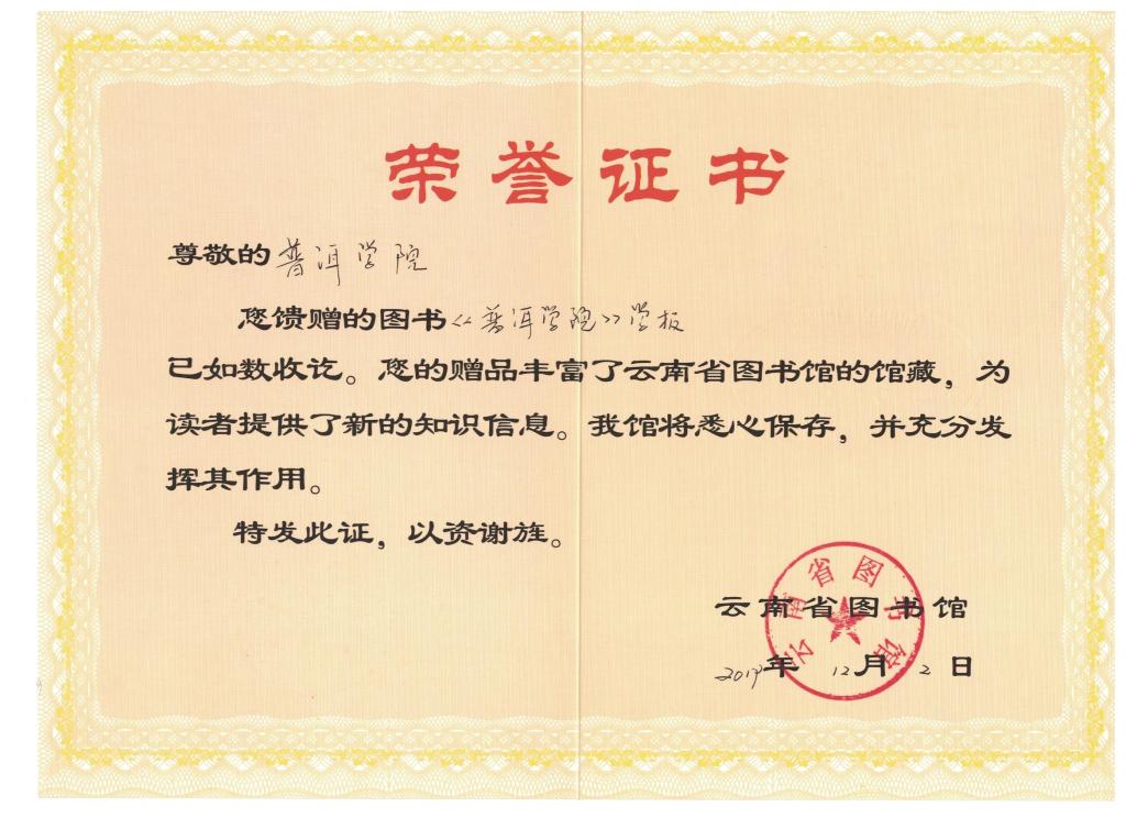 云南省图书馆向《www.2396196827.com 学报》颁发收藏荣誉证书