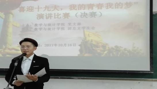 数学与统计学院为持续推进“两学一做”学习教育常态化制度化,培育和践行社会主义核心价值观,进一步提高青年大学生思想政治素养,营造“喜迎党的十九大”良好氛围,10月16日晚,数统学院学生支部和团总支学生会共同举办了“喜迎十九大 我的青春我的梦”的主题演讲比赛。