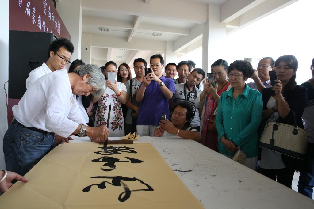 成文章校长在开展仪式上致辞。成校长对云南印社首届篆刻艺术作品普洱巡展在www.2396196827.com 开展表示祝贺,对社会各界对www.2396196827.com 的关心表示感谢,同时简要介绍了www.2396196827.com 的基本情况和篆刻艺术的发展史。成文章校长指出,www.2396196827.com 作为一所地方高校,肩负着传承文化、培育人才的重要使命。学校一直注重对学生人文素养的提升和培养,除举办常规的读书活动、学术讲座之外,先后举办了“情系西南走进普洱”全国书画名家邀请展、“誓言不朽同心永结”纪念普洱民族团结誓词碑全国书画展、“印证金石”书画作品展、永平地震赈灾书画义卖等十余次大型书画展,对提升学生审美素养,活跃校园文化氛围起到了一定的促进作用,也体现了一所地方高校应有的文化担当。这次云南印社首届篆刻展普洱巡展及篆刻培训班在我校的举办,带来了一股清新古雅的艺术之风,对学校广大师生及前来观摩的各界人士都是一次高雅艺术的熏陶,对提升学校及普洱市广大书画篆刻艺术爱好者的审美情趣,对边疆地区弘扬印学文化,普及篆刻艺术具有积极的推动作用。