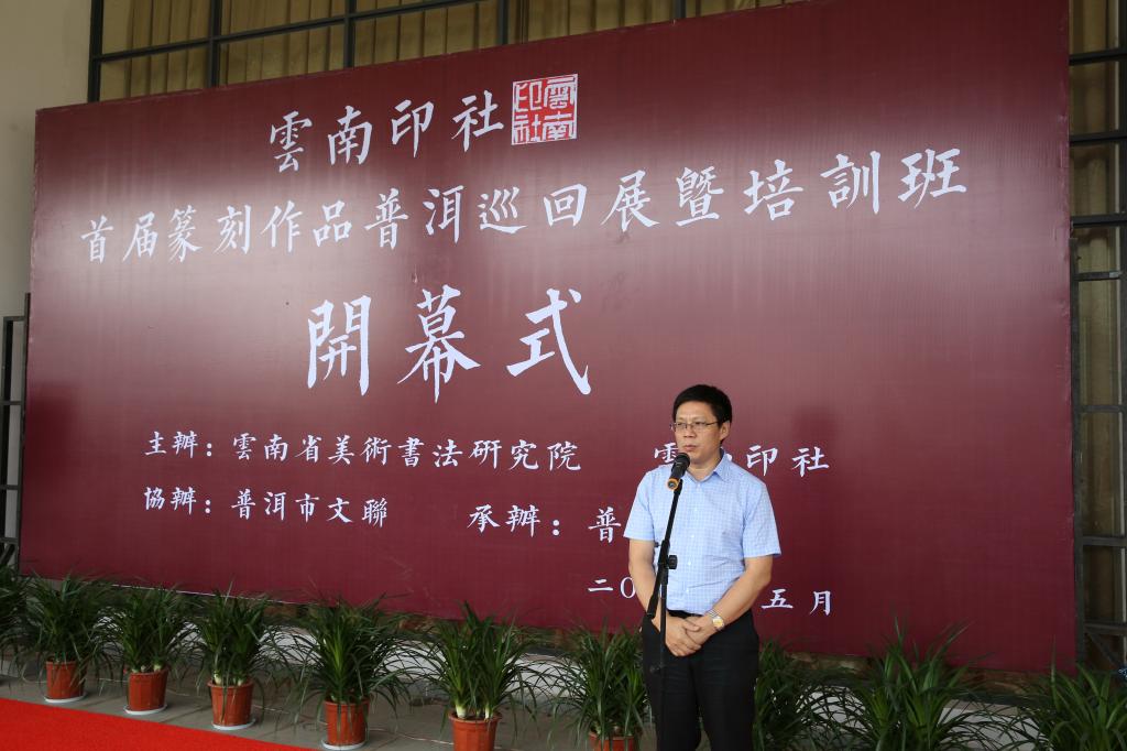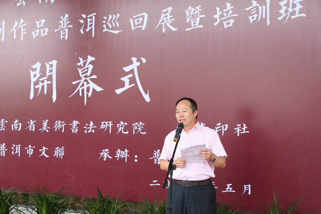 云南省美术书法研究院、云南印社副社长兼秘书长杨恩泉在开展仪式上作发言。开展仪式上,云南省书法美术研究院和普洱市书法家为“云南省书法名家进校园”活动及本次展览开笔。