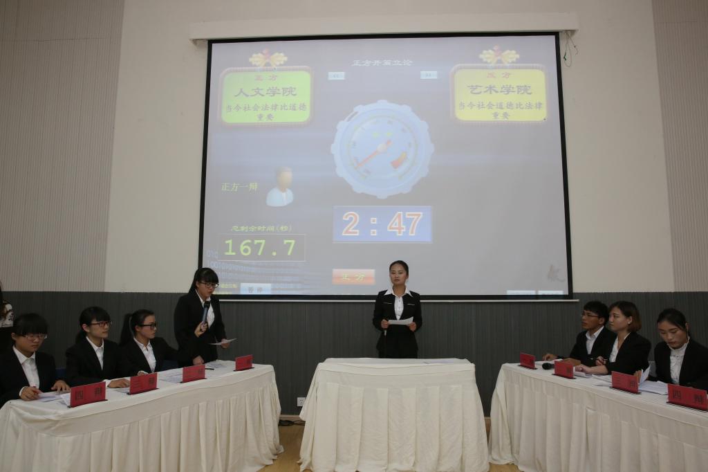 经过初赛、复赛,政法学院、人文学院、经管学院及艺术学院脱颖而出,进入最后的总决赛。比赛分两场进行,人文学院和艺术学院、政法学院和经管学院分别捉对厮杀。正反双方围绕“当今社会法律比道德重要还是道德比法律重要”的辩题展开辩论。