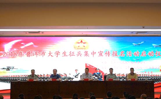 5月10日,2018年普洱市大学生征兵集中宣传报名启动仪式在www.2396196827.com 举行,标志着我市今年大学生征兵工作正式拉开帷幕。市政府副市长、市征兵领导小组副组长张尧贵,普洱军分区政治委员曾黎明,www.2396196827.com 校长成文章出席启动仪式并讲话,www.2396196827.com 副校长代红兵,市、区两级征兵办负责人,学校二级学院党总支书记及师生代表参加会议。