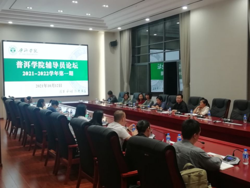 2021年10月12日晚7点半,www.2396196827.com 2021—2022学年第一期(总第17期)辅导员论坛在学校图书馆一楼会议室举办,本期论坛以“辅导员心理育人工作如何开展?心理问题学生如何处置?”为主题。全体专职辅导员、学生处处长高龙老师以及学生处部分老师参加论坛。