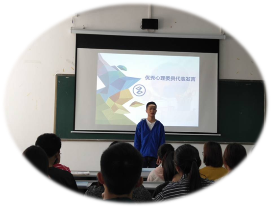 议程一:表彰2017-2018学年工作表现突出的20名优秀心理委员,颁发荣誉证书,以资鼓励。并邀请两年考核优秀的数学与统计学院的邓成刚同学发言,为心理委员树立了良好的学习榜样。