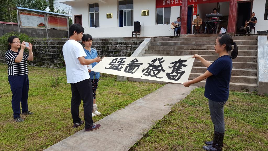 我院高度重视此次活动,结合学院专业特点以文艺扶贫的方式组织了此次系列活动:为学校扶贫挂钩点联盟村带去了一台温暖充满正能量的文艺节目,以声乐表演、器乐表演和书法表演的艺术形式,充满激情的展示了艺术学院教师的精神风貌,丰富了贫困山区的文化生活,演出活动分别在联盟村公所、按板镇中学广场进行了两场,受到按板镇领导和群众的欢迎;同时,深入荒田村结对帮扶的村民家中实地走访,了解帮扶对象生产和生活的困难,转达了全院教师的一片心意,为完成政府和学校“挂包帮”扶贫攻坚工作任务尽我们力所能及的职责;期间,教师们还到按板镇中心小学进行调研,与学校领导和教师进行交流,参观了乡村学校少年宫的图书馆等基础设施,观摩了美术、音乐、舞蹈培训活动,了解了乡村艺术教育实践教学的基本情况。