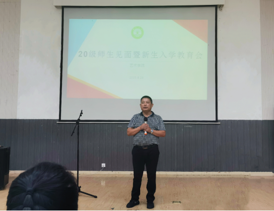 韩兴副院长代表艺术学院致辞并介绍艺术学院全体教师及20级各专业新生班学生。段群勇书记强调学校安全管理、纪律管理、规章制度的实施政策,并重申疫情期间师生严格按校要求实行防控管控的重要性,帮助新生树立正确的世界观、价值观和学习观,