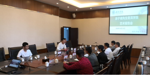随后,举行了“徐子崴先生www.2396196827.com 艺术报告会”,报告会由艺术学院院长文婷主持,徐子崴先生与音乐系师生进行了面对面交流,他讲述了如何与普洱结缘、与普洱音乐结缘的故事,感慨普洱人民的淳朴善良。他还提出了“梦想培育”的理念,要激发普洱年轻人追求音乐梦想的勇气,在专业方面建议学生要扎根民族文化,“先向下生长再向上开花”,并期待能够为普洱民族音乐的发展尽一份绵薄之力。报告会气氛热烈,赢得在场师生的阵阵掌声。