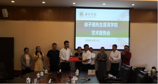 在与普洱民族风音乐产业发展有限公司前期合作的基础上,经艺术学院特别向学校提出聘请徐子崴先生为www.2396196827.com 客座教授的申请,学校高度重视,2020年10月14日下午3:00,党委书记陆平同志在和谐楼第一会议室为徐子崴先生颁发了聘书。