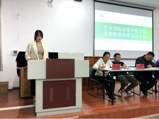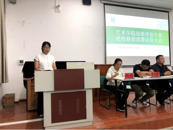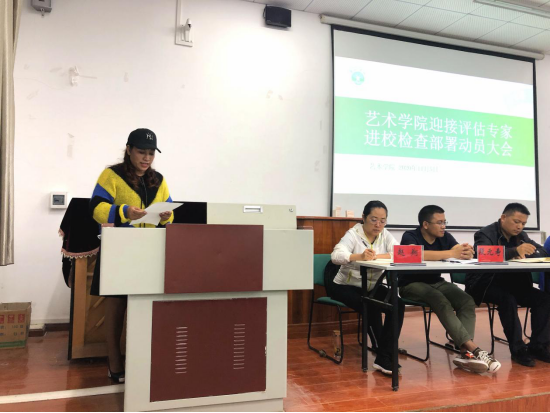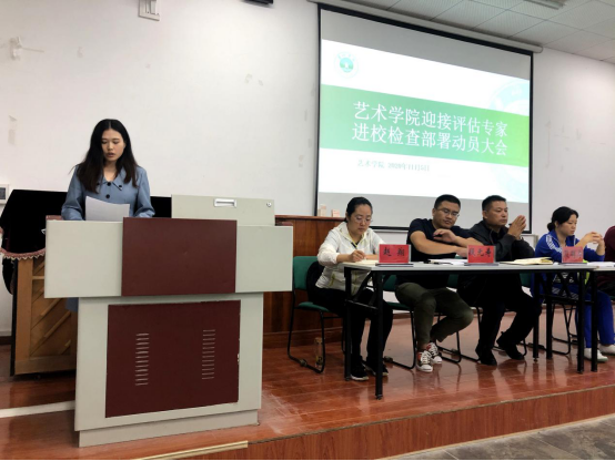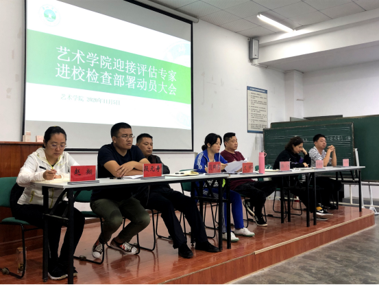 2020 年 11 月 5 日,星期四下午19:30,艺术学院为进一步配合学校确保评估工作顺利推进,如期达成评估目标,组织开展迎接评估专家进校检查部署全院教职工动员大会,对合格评估期间工作做出统筹安排。会议在学院文婷院长主持下于明德楼2-506教室召开,艺术学院全体教师参加会议。