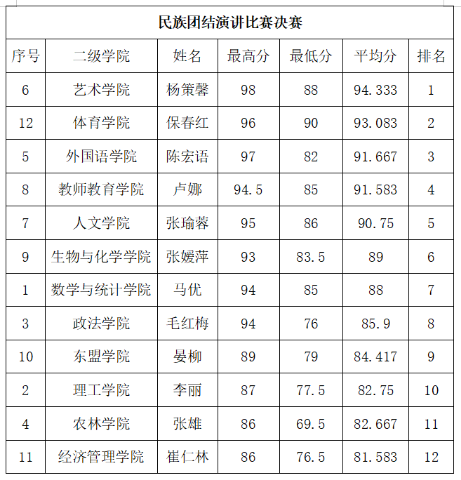 2020年11月18日19:00,2020年民族团结主题演讲比赛校级决赛在明德楼406举行,艺术学院19级工美班(本)杨策馨以94.333的好成绩排名第一。