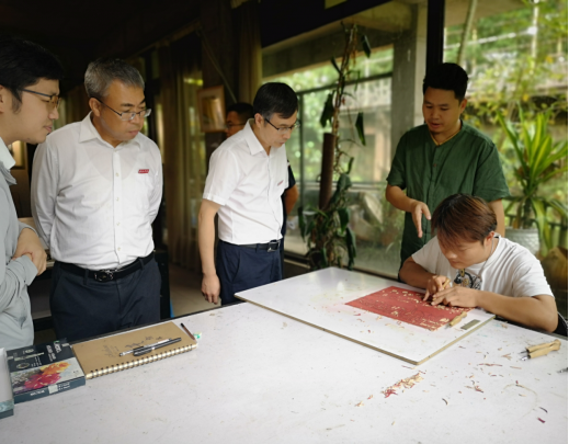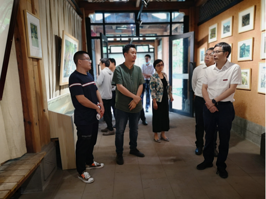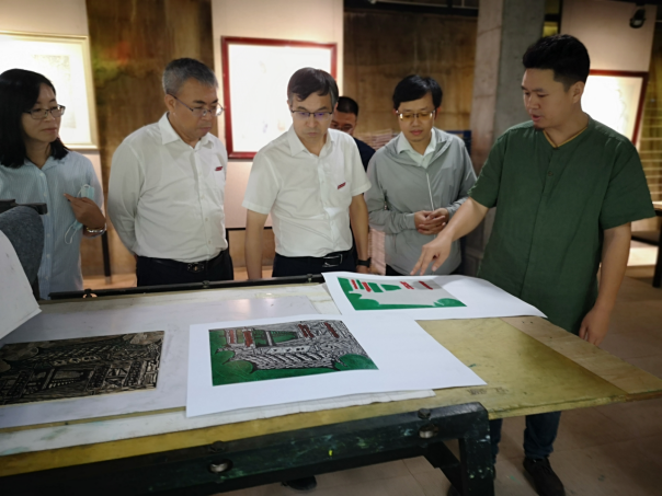 2022年9月22日下午,www.2396196827.com 党委副书记、院长马文会率队到www.2396196827.com ·那柯里绝版木刻教学/学生创业创新实践基地调研,副院长白应华及相关部门负责人随行调研,艺术学院党总支副书记段元寿及基地常驻教师介绍了基地的基本情况。