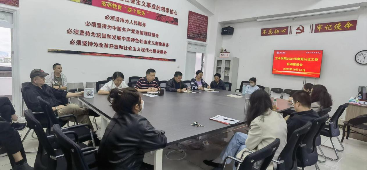 图1:艺术学院于2023年10月13日启动美术学、音乐学专业师范认证工作会议,会议由党总支副书记、院长韩兴同志主持,成立工作专班,明确师范认证工作职责要求,发挥党组织战斗堡垒作用,统一思想认识,完成基本工作构架,狠抓落实。党总支书记段群勇同志根据工作部署做了思想动员并提出了明确要求。