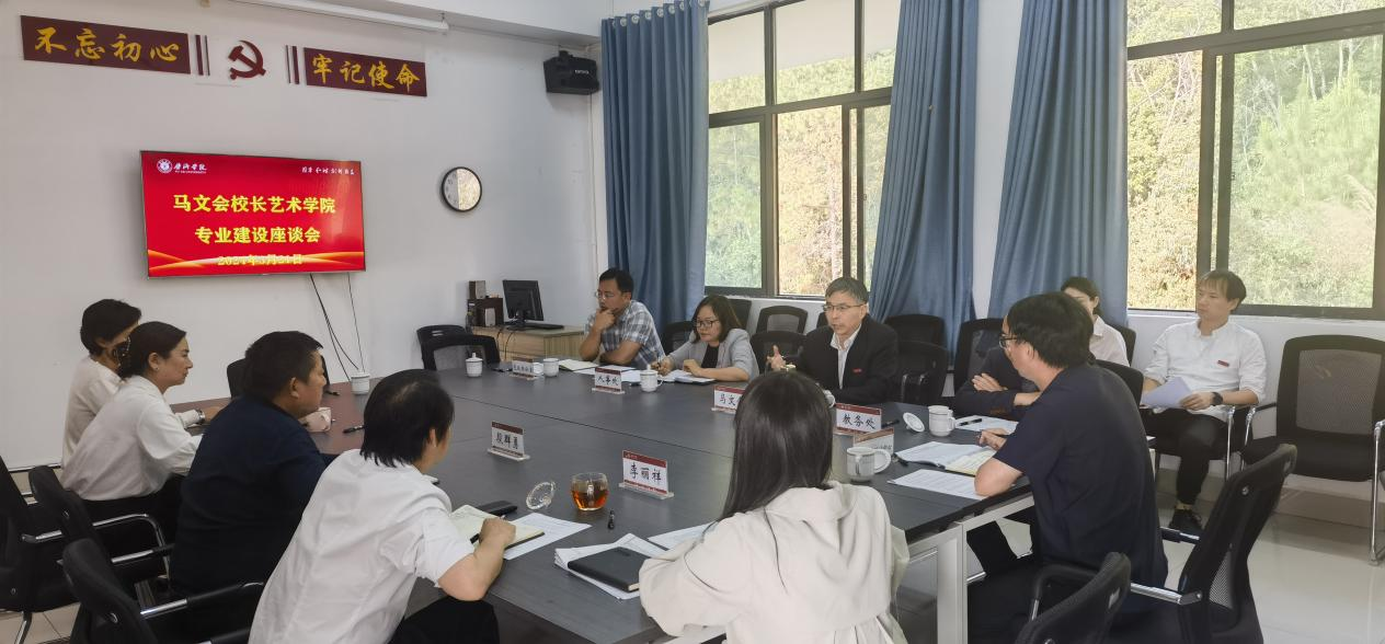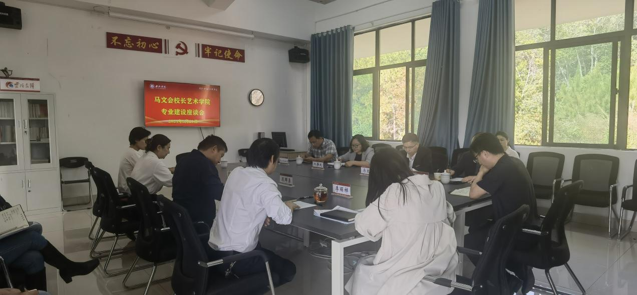 2023年3月21日下午15:00,马文会校长带领党政办公室、人事处、教务处、教学质量评估中心负责人到艺术学院开展专业建设调研,对学院专业建设进行指导。艺术学院科级以上领导干部及部分教师代表参加调研座谈会。