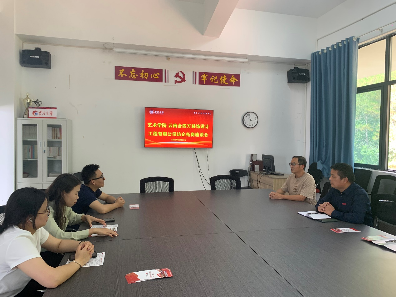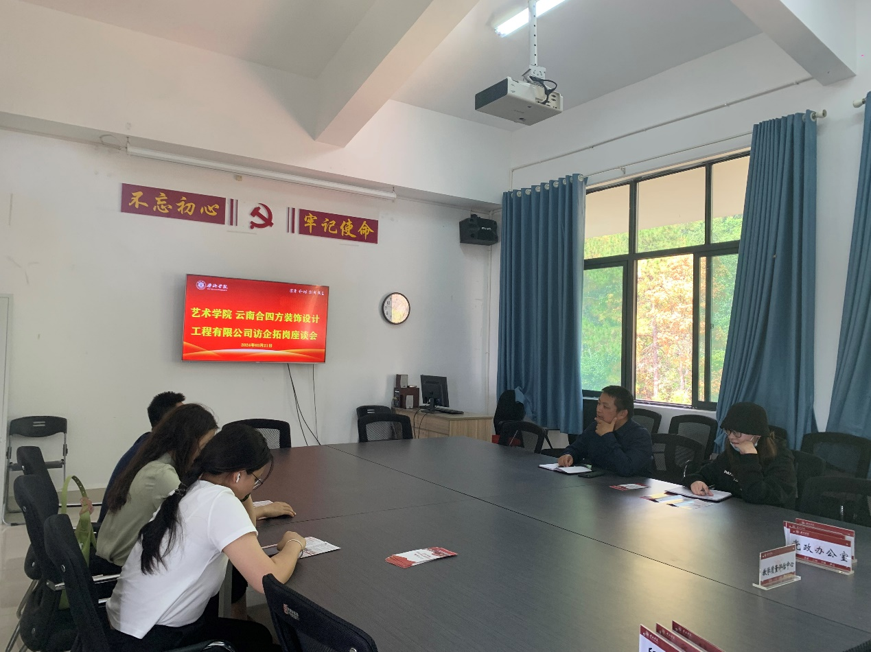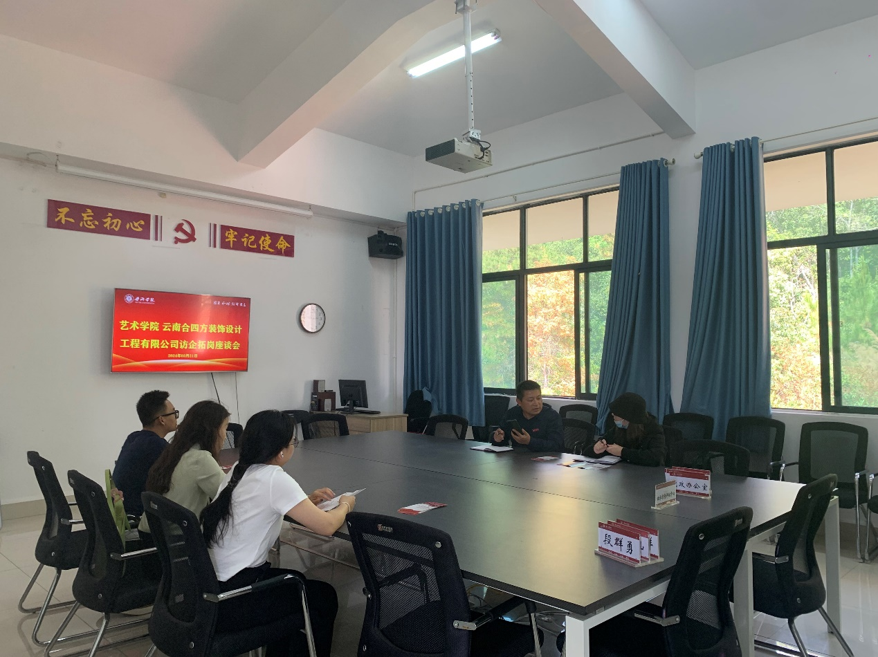 为深入学习贯彻习近平新时代中国特色社会主义思想和党的二十大精神,落实教育部、省委教育工委、学校党委关于高校毕业生就业工作的决策部署,进一步拓展岗位资源,凝心聚力做好就业服务工作。3月21日下午,艺术学院在韶韵楼5楼艺术学院会议室与云南合四方装饰设计工程有限公司开展访企拓岗促就业专项行动。座谈会由艺术学院党总支书记段群勇主持,教务科科长刘文斌及负责就业工作的辅导员参加座谈会。