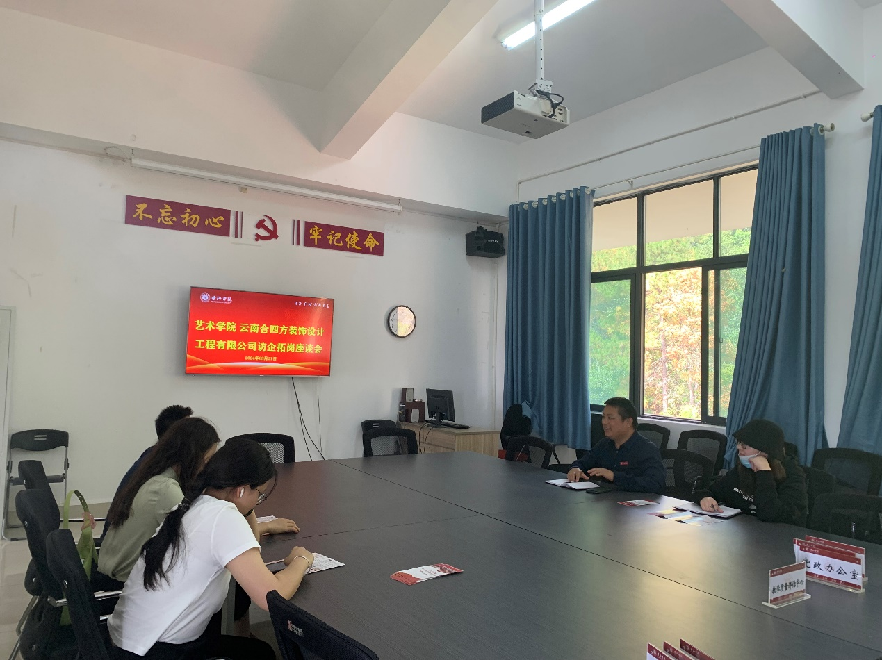 座谈会上,教务科科长介绍了艺术学院相关专业的基本情况并希望双方以人才培养、契合企业发展规划和推动学生高质量就业为导向,建立人才培养、学生就业学生实习等方面的长期合作,云南合四方装饰设计工程有限公司相关负责人介绍了公司主营业务、人才需求等基本情况,表示欢迎艺术学院相关专业同学加入云南合四方装饰设计工程有限公司,公司将为新入员工提供完备的培训和良好的晋升渠道。